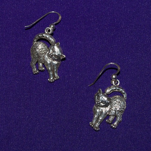 Silver cat drop earrings.
